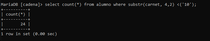 select count(*) from alumno where substr(carnet, 4,2) < ('10');