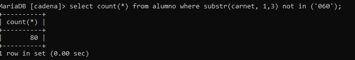 select count(*) from alumno where substr(carnet, 1,3) not in ('060');