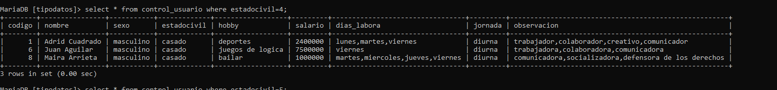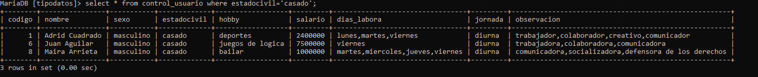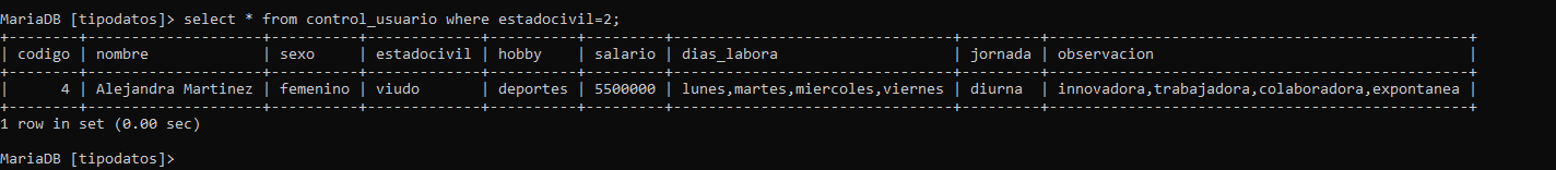 select * from control_usuario where estadocivil = 4; //En el listado de datos 4 es el numero de orden para casados en el campo-. (Tipo dato Enum).