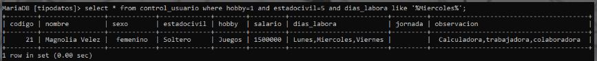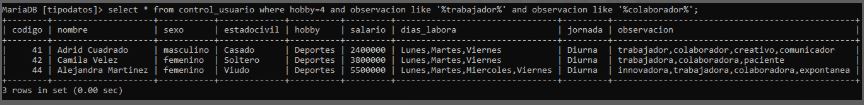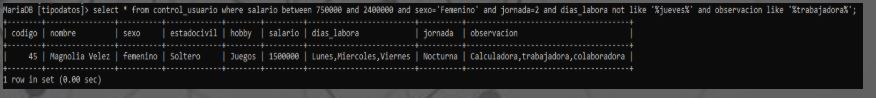 select * from control_usuario where salario between 750000 and 2400000 and sexo='Femenino' and jornada=2 and dias_labora not like '%jueves%' and observacion like '%trabajadora%';
