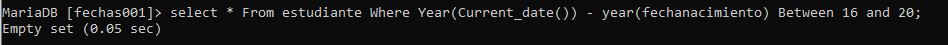 select * From estudiante Where Year(Current_date()) - year(fechanacimiento) Between 16 and 20;