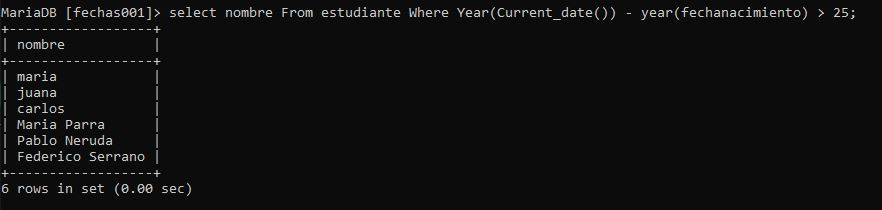 select nombre From estudiante Where Year(Current_date()) - year(fechanacimiento) > 25;