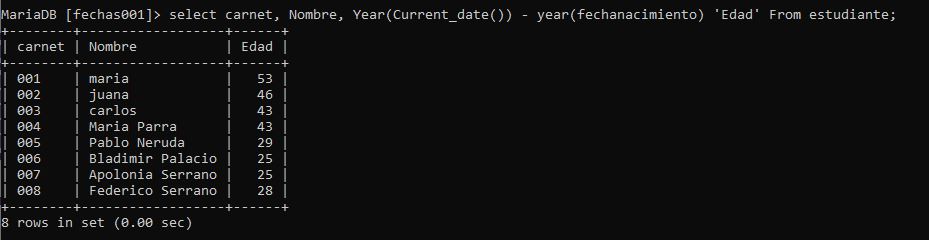 select carnet, Nombre, Year(Current_date()) - year(fechanacimiento) 'Edad' From estudiante;