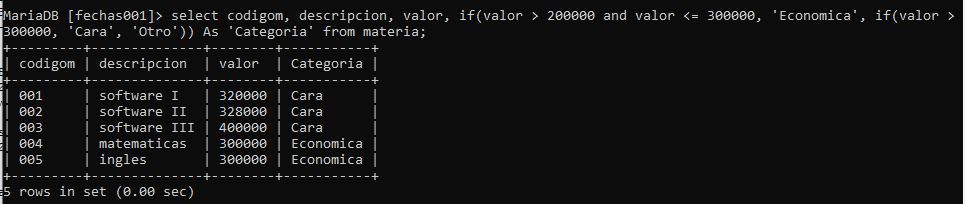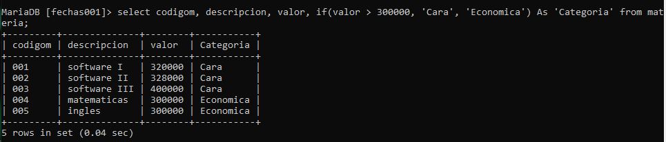 select codigom, descripcion, valor, if(valor > 300000, 'Cara', 'Economica') As 'Categoria' from materia;