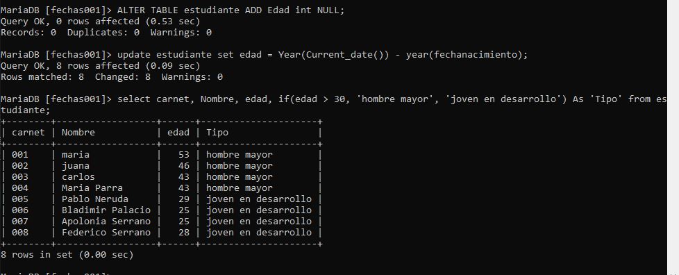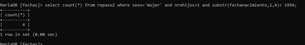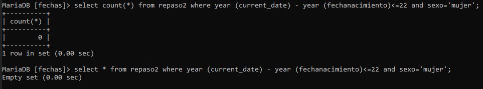 MariaDB [fechas]> select * from repaso2 where year (current_date) - year (fechanacimiento)<=22 and sexo='mujer';