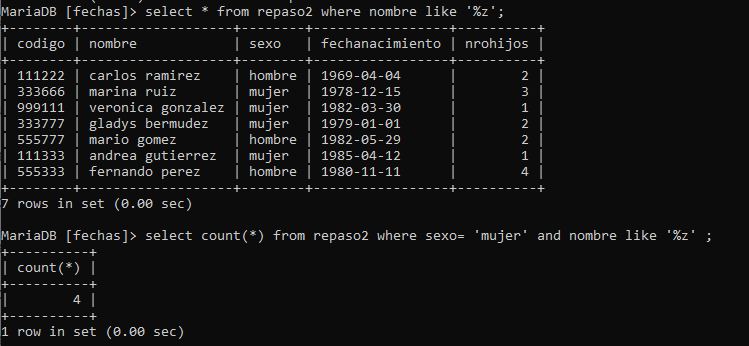 select count(*) from repaso2 where sexo= 'mujer' and nombre like '%z' ;