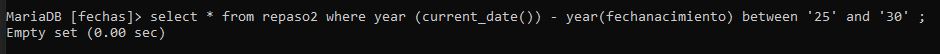 select * from repaso2 where year (current_date()) - year(fechanacimiento) between '25' and '30'