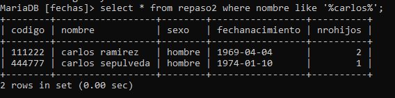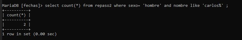 select count(*) from repaso2 where sexo= 'hombre' and nombre like 'carlos%' ;